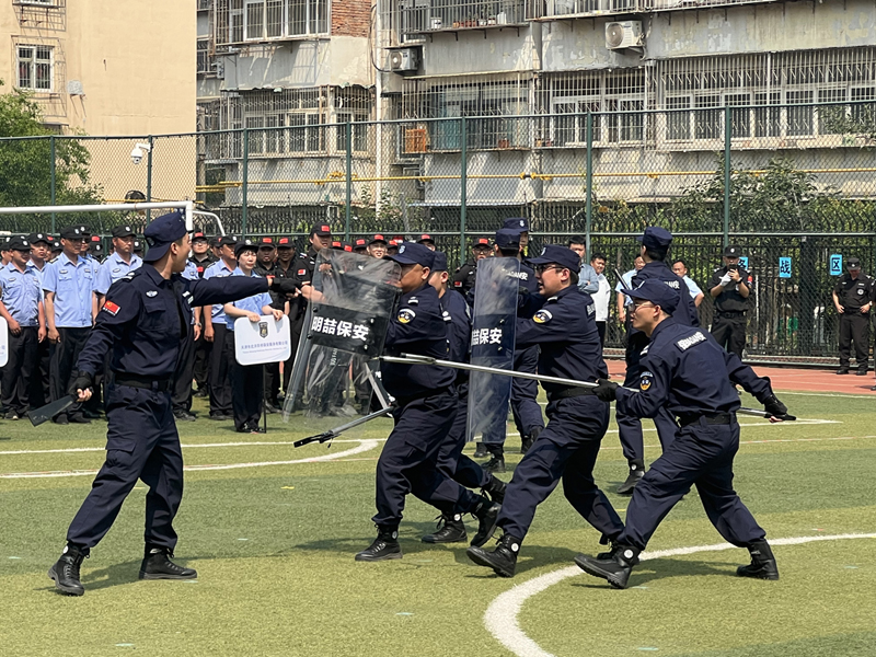 活动在庄严的升旗仪式中正式拉开帷幕,全区各保安公司的精英团队队列整齐,昂首阔步有序入场。队形队列展示、“军体拳”展示、警棍盾牌术、“应急棍”展示中,各安保队伍动作整齐划一,斗志昂扬,展现出安保人员良好的专业素养和精神风貌。在最小作战单元处置、消防综合救援演练、校园反恐防暴演练中,现场分别模拟校园内发生火灾、暴徒闯入等紧急事件,各安保团队快速反应、冷静应对、分工明确,手持专业器材器械,救助火灾伤员、与“暴徒”进行周旋,高效处置校园突发事件。安保人员们彰显出临危不乱的应急素养,熟练展示规范应急处置方法以及团队协作能力。